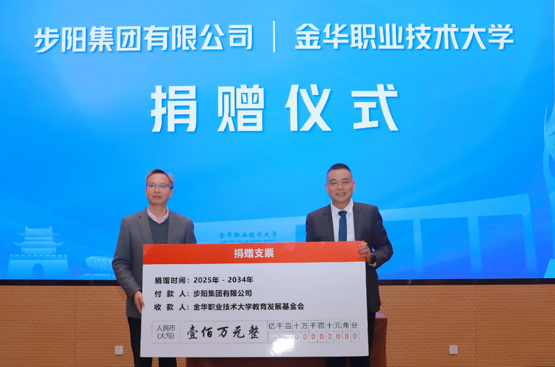 活动现场,步阳集团与金华职业技术大学签署战略合作协议,并捐赠100万元用于支持学校教育事业发展。徐步云董事长表示:企业的成长离不开社会的滋养,回报社会、培养未来栋梁,是步阳义不容辞的责任。